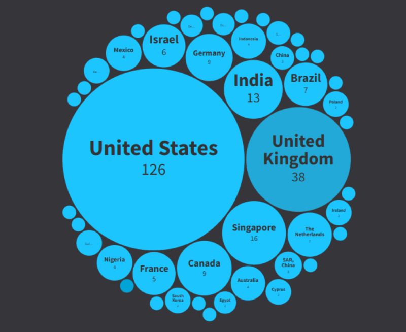 Наибольшее количество финтех-компаний в списке сосредоточено в США. Штаб-квартиры 126 компаний расположены в крупнейшей экономике мира. Великобритания занимает второе место, где расположены 38 ведущих финтех-компаний. CNBC позже в этом году опубликует отдельный отчет со списком ведущих финтех-компаний Великобритании.