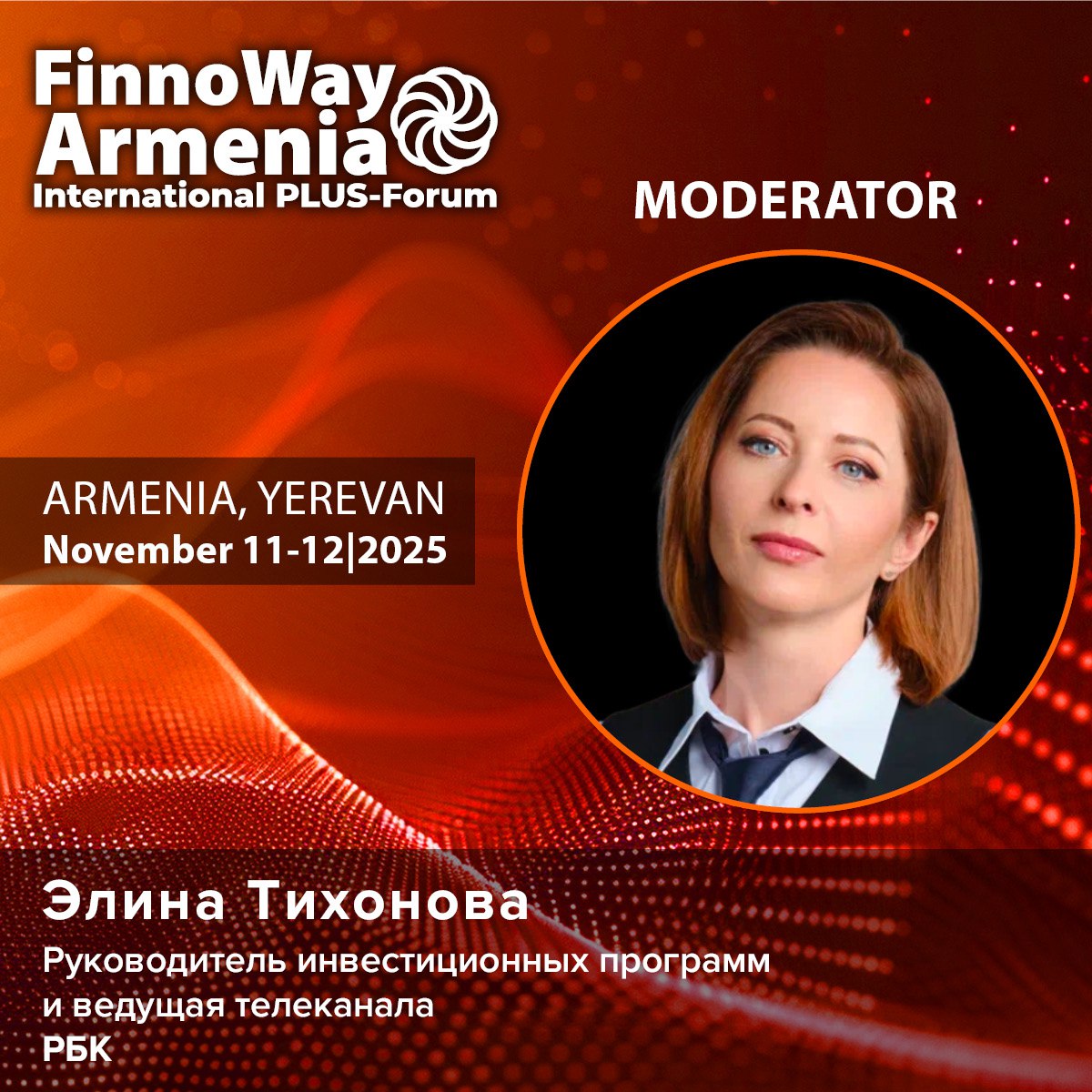 Элина Тихонова, руководитель инвестиционных программ и ведущая телеканала РБК (Elina Tikhonova Head of investment programs department, RBC TV), примет участие в первом Международном ПЛАС-Форуме FinnoWay Armenia.