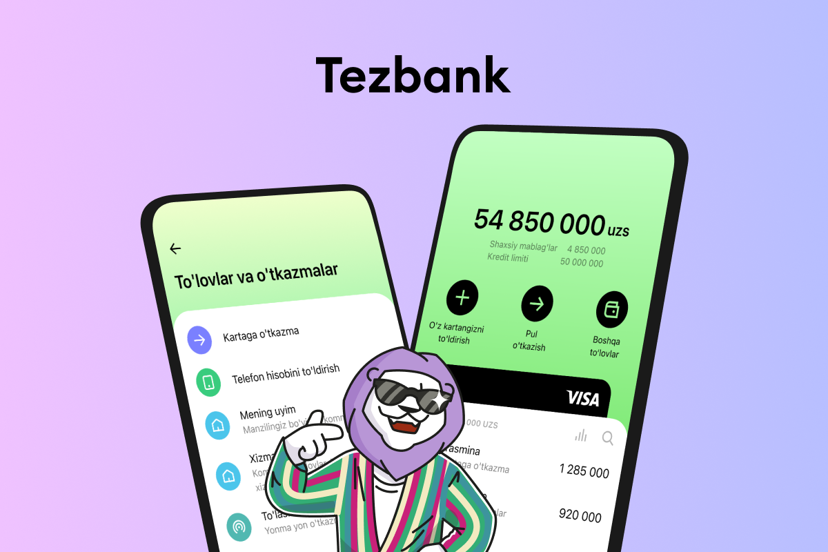 Tezbank позиционируется как полностью мобильный банк без необходимости посещения офисов. Его ключевым решением станет универсальная карта формата «2 в 1», которая совмещает кредитный и собственный счета. Даже пользователи без кредитной истории смогут рассчитывать на приветственный лимит.
