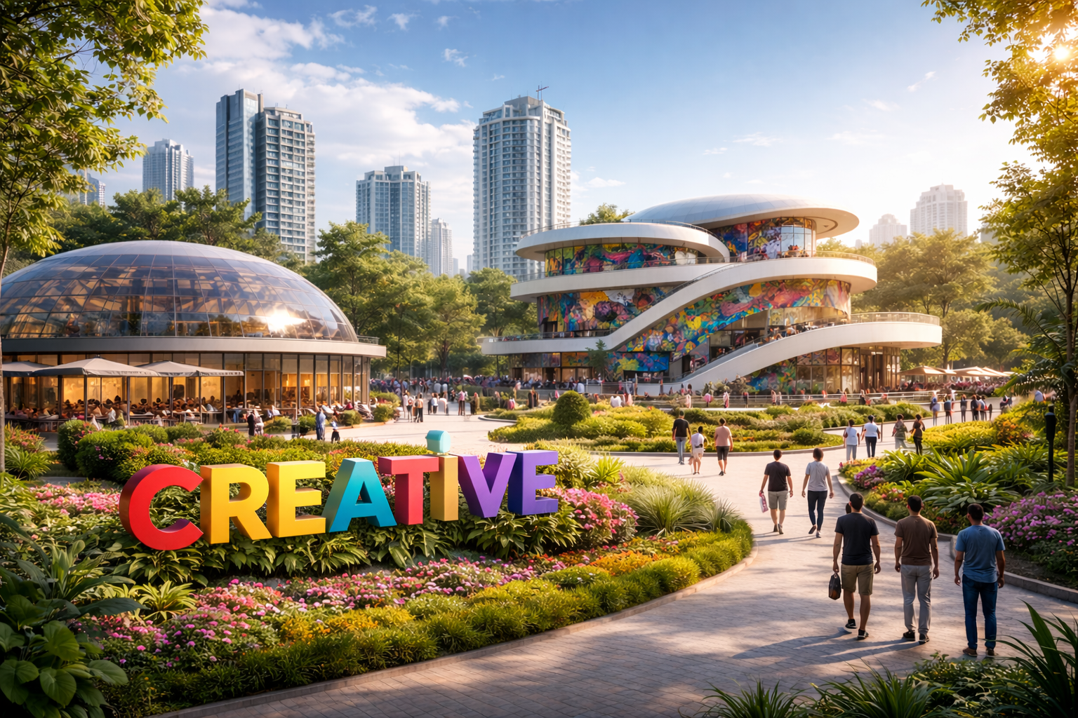 В его структуру войдут зелёная зона для прогулок и отдыха с арт-объектами и произведениями монументального искусства, международная школа цифрового дизайна и программирования, бук-кафе, спортивные и воркаут-площадки, гостиница, павильон деятелей искусств, креативные мастерские, экологичные офисы и коворкинг-центр.