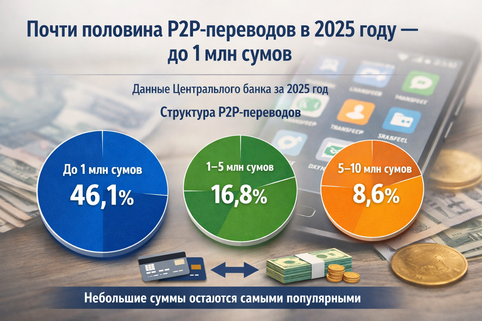 Наибольшую долю операций — 46,1% — составили переводы на сумму до 1 млн сумов. Фактически каждый второй P2P-перевод в течение года приходился на небольшие суммы.